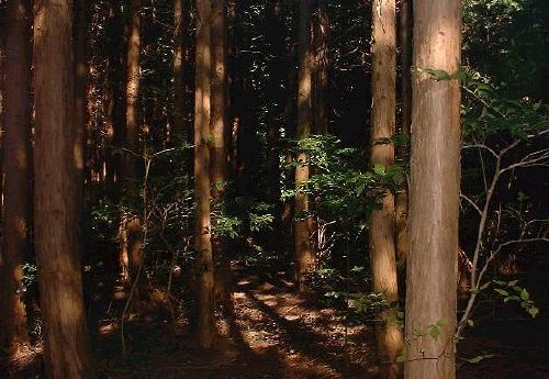 薄暗い杉林の中を