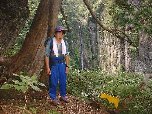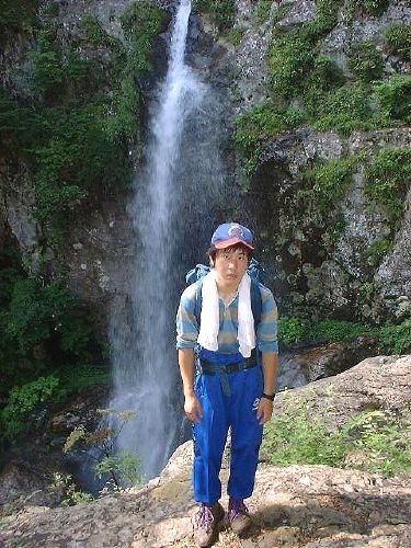 ここからがいよいよこのコースの核心部だ。気合いを入れて出発。二ノ滝、三ノ滝を過ぎ、垂直の梯子登りが続き、途中の右手が切れ落ちたフェースの、以前だったら岩登りをさせられた所も、新しい鎖がかけられていた。地元の人の苦労には頭が下がる思いだ。木の根をつかんで這い上がり、岩峰を越え、少し下ったら双門ノ大滝、仙人嵒の大岩壁を前方に望むテラスに11時過ぎに到着。ここで大休止、行動食を食べ腹ごしらえ。