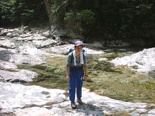 桶ノ谷出合で右手の本谷に入り、最後の悪場にかかる。ここのオーバーハングを乗り越す所には、新しい鎖梯子が架けられていたが、これを使わずに、水流に沿って斜瀑の横のチムニー状の岩場をよじ登る方が簡単に上に出られる。次に現れる、以前だったら頼りない針金を頼りにトラバースした悪場も、新しい鎖が架けてられていて簡単に通過できた。もう悪場は終わりだ。河原を進むと狼平手前の橋が見えてきた。狼平に15時少し過ぎに到着。今日は約9時間の行動だった。