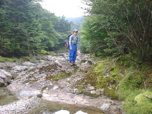 休憩後、ザンキ平へ至る尾根を登り肩の鞍部から鎖場を下るのだが、ここも新しく鉄梯子が架けられていた。小沢をいくつか横切りながら、再度河原に下り立った。暑いのでかなりヘロヘロになっていて浴びるほど水を飲む。