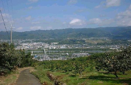 龍門橋のたもとに車を置いて、9時20分頃、まっすぐ龍門山に向かって歩き出して、農道の急な登りを登る。途中後を振り返れば、粉河の街が下の方に見える。もうかなり登っている。周りは、ミカンや柿等の果樹畑が広がっている。しかしこの農道の登りはけっこうキツくて一汗かかせられる。