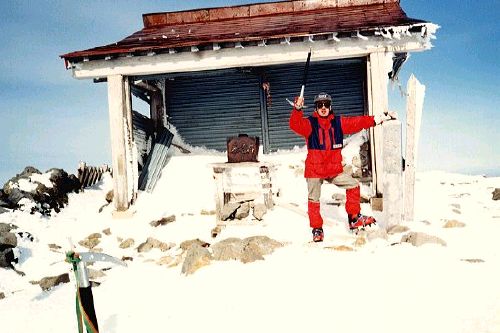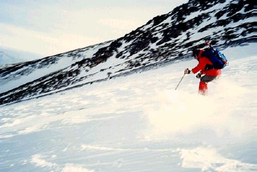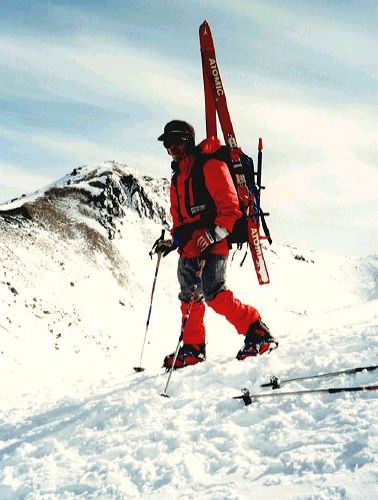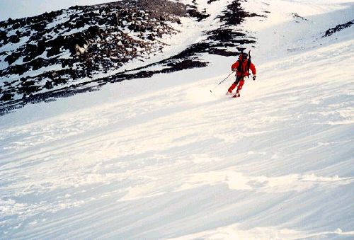 乗鞍高原スキー場の上部にテントを設営後、切り開きを登り、位ヶ原から肩の小屋までシールで快調な登高。ここからスキーを担いで剣ヶ峰を目指して登った。旭日岳との鞍部にスキーをデポして剣ヶ峰へ。旭日岳との鞍部から滑降スタート。雪質も最高で快心の滑りであった。